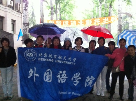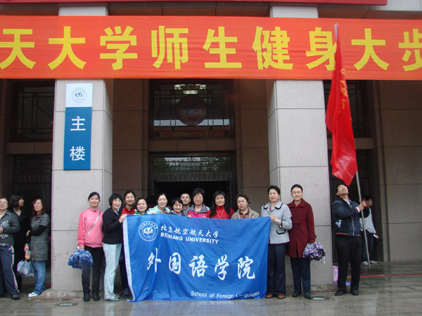 2011年4月22日下午两点,乌云密布,雷声滚滚,大雨纷纷,北京的大街上几无行人。然而,北航校园里却出现了一道亮丽的风景:北航工会教工“健身大步走”活动如期举行。健步走队伍举着五颜六色的大旗、撑着五彩斑斓的雨伞,迈着无所畏惧的步伐,趟着满地的雨水,沿着老主楼周围的道路健步而行。