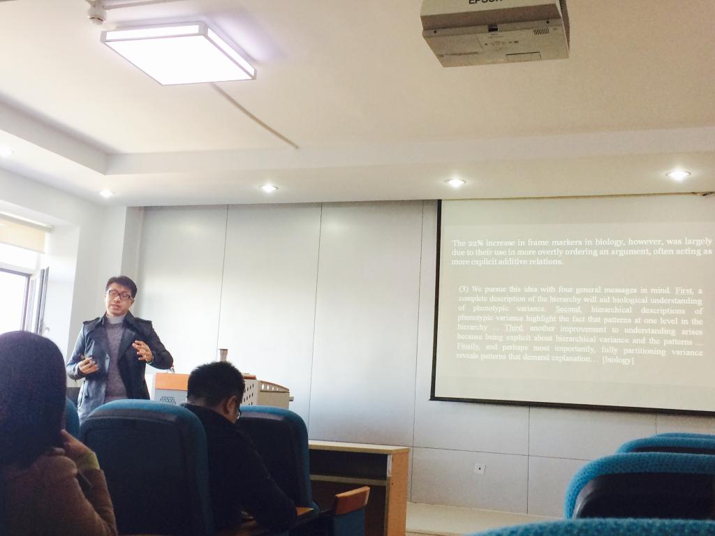 20171030日,吉林大学公共外语教育学院,匡亚明特聘教授姜峰应北航外国语学院邀请,在如心楼806为我院师生带来题为“Disciplinarymetadiscourse and academic Interaction: Where’s it all Going?”的精彩讲座。外国语学院董敏副院长主持了本次讲座。