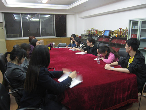 2014年3月24日晚9:30分,外国语学院研会主席团及各部部长在如心楼409召开了本学期的第一次会议,总结了上一学期的工作,并制定了下学期的主要工作计划。研会主席宋炳霖主持了会议。